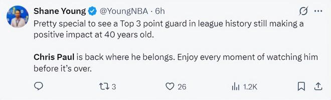 美记Shane Young:能亲眼目睹一位联盟历史前三的控球后卫,在40岁高龄还能发挥如此积极的作用,这太令人惊叹了。
